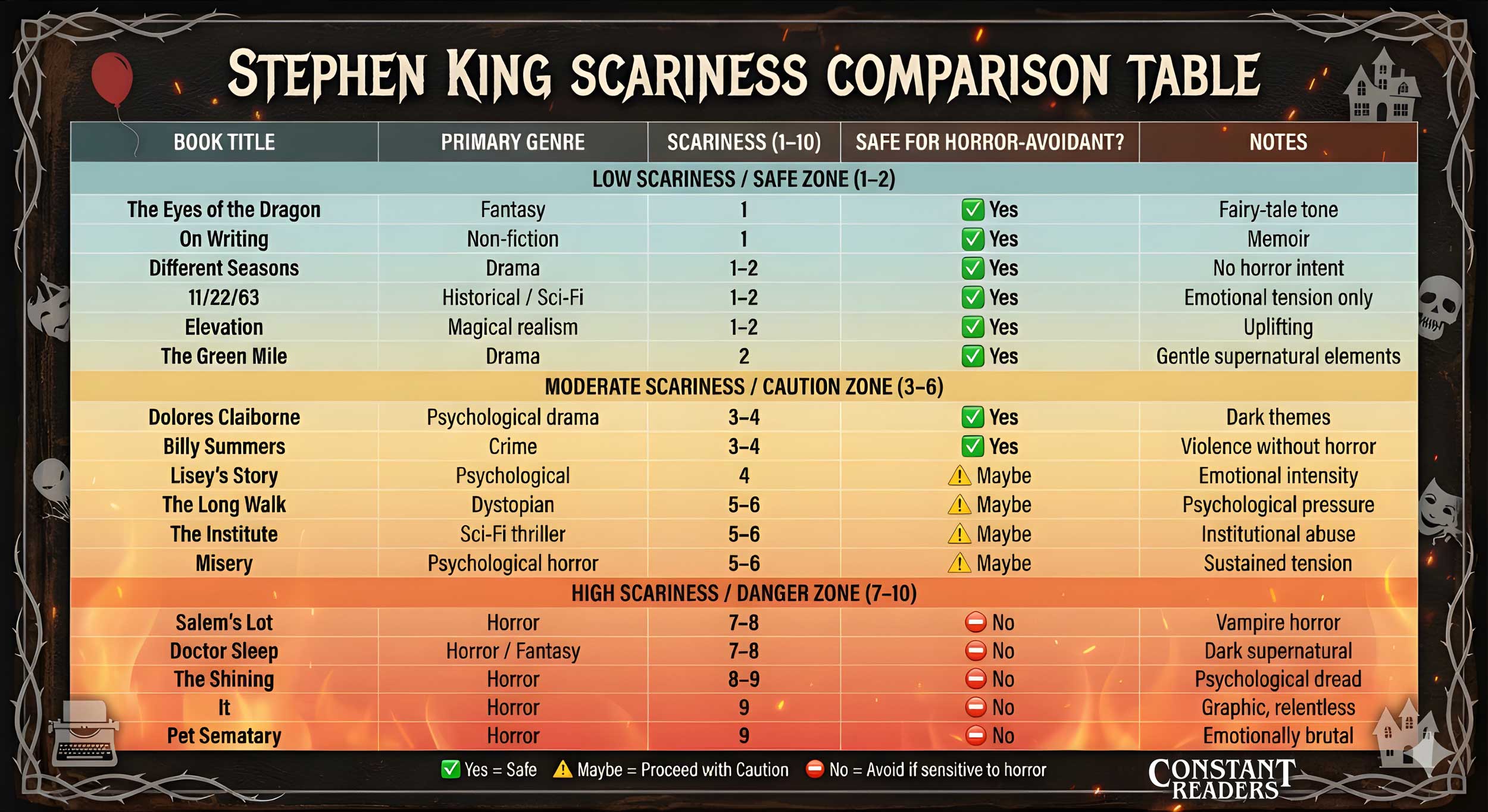 This guide exists for one reason: clarity. Stephen King’s catalog is huge, and “horror” only describes part of it. Some of his books are gentle, reflective, or even comforting. Others are intentionally disturbing. Most fall somewhere in between.